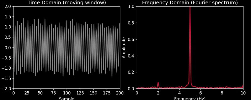 A core result of signal analysis is the Fourier transform. It expresses a signal as a unique linear sum of sine waves, thereby representing a time-varying intensity as a superposition of static waves. You can also think of it as a change of basis, from a measurement at each point in time, to a measurement of each frequency’s contribution. For our purposes, it is simply a tool for looking at the same data in a different way, with the intention that the transformed data reveals a pattern.